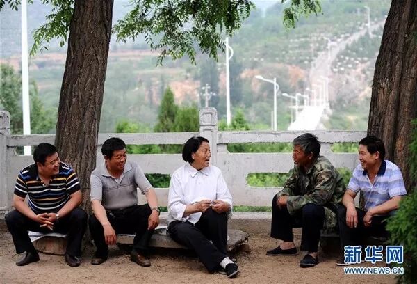 申纪兰(中)在山西省平顺县西沟村和村民交流(2011年6月13日摄)。
