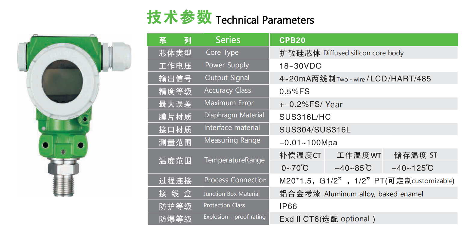 CPB系列压力变送器采用多种形式,针对不同的工况/要求随心选用合适的产品。产品采用精密补偿技术,生产的压力传感器具有高精度、高稳定性。该系列产品采用多项新技术,结合国际最先进的阻式压力变送器设计制造技术,具有全不锈钢结构和标准化的信号输出、大量程测量范围的特点,精度高、免调校、量程覆盖范围宽,本产品已广泛用于石油、化工、冶金、电力、食品、造纸、医药、机械制造等行业。